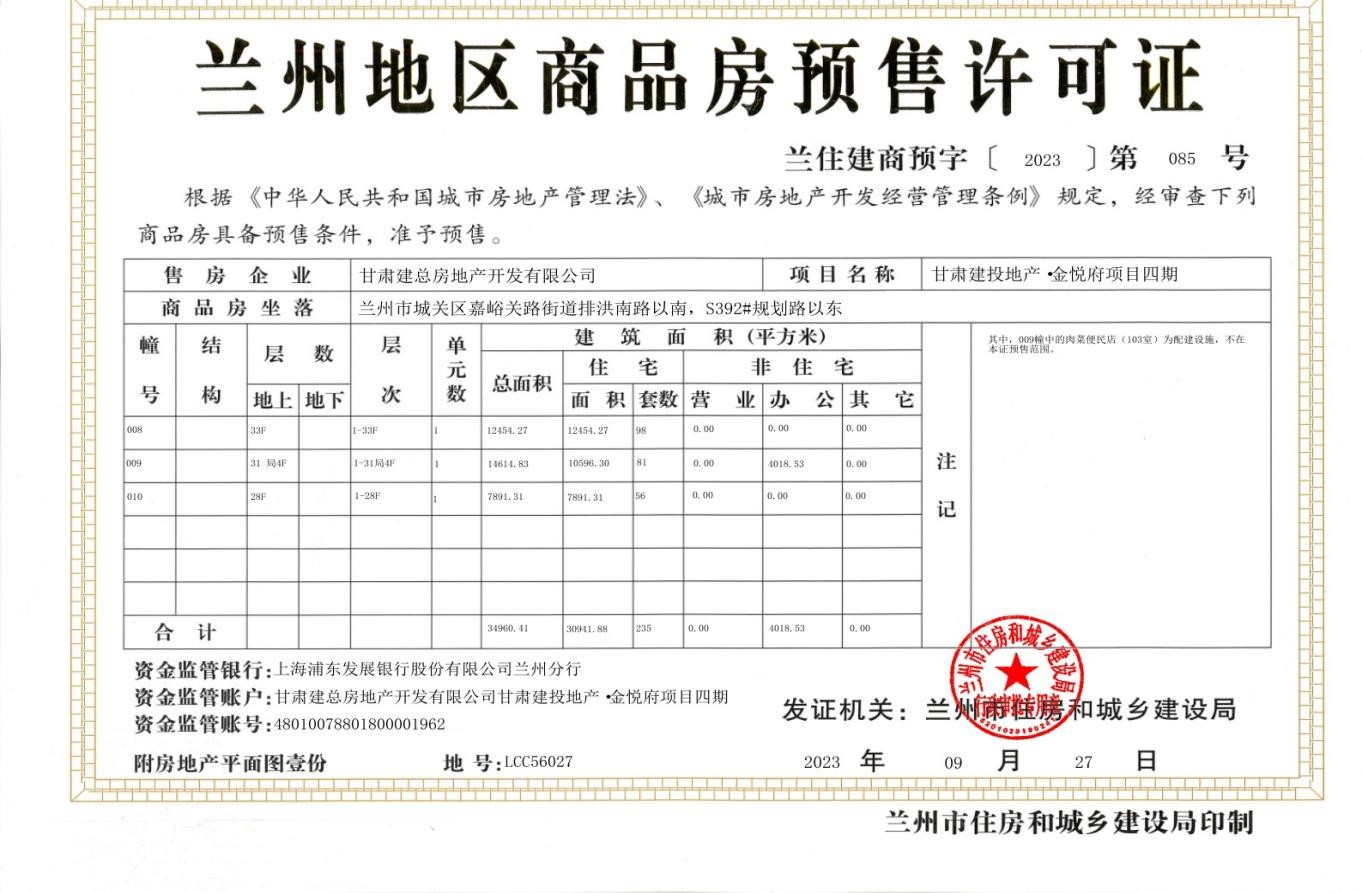 預售許可證的取得是公司為甘肅建投70歲生日獻禮,是置業(yè)公司房地產(chǎn)營銷專題會會議精神的落實,是金悅府項目四期在“金九銀十”的銷售行業(yè)旺季順利開盤的強心劑。
