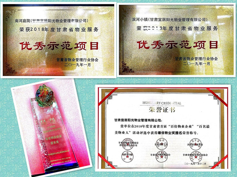 1月12日, 在甘肅省首屆“百家物業(yè)企業(yè)”、“百名最美物業(yè)人”評(píng)選活動(dòng)頒獎(jiǎng)晚會(huì)中,置業(yè)公司旗下的宜居陽(yáng)光物業(yè)管理有限公司榮獲“最佳物業(yè)企業(yè)提名獎(jiǎng)”,南河庭院項(xiàng)目主任金蘭榮獲甘肅物業(yè)行業(yè)貢獻(xiàn)獎(jiǎng)。同日在首屆甘肅省省優(yōu)示范項(xiàng)目評(píng)定中由宜居陽(yáng)光物業(yè)管理的南河庭院物業(yè)項(xiàng)目、濱河小鎮(zhèn)物業(yè)項(xiàng)目均獲得“甘肅省物業(yè)服務(wù)優(yōu)秀示范項(xiàng)目”的榮譽(yù)稱(chēng)號(hào)。